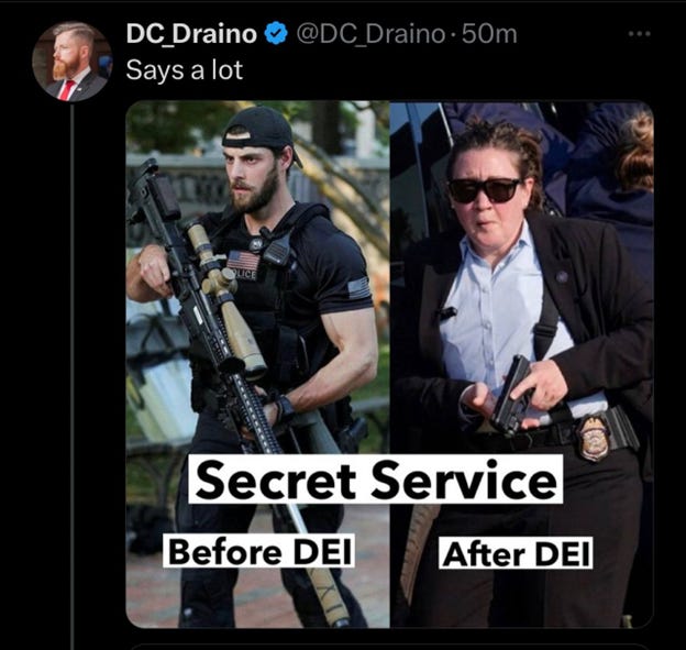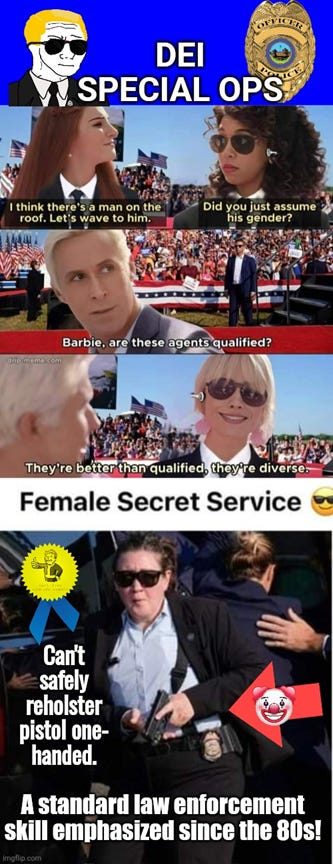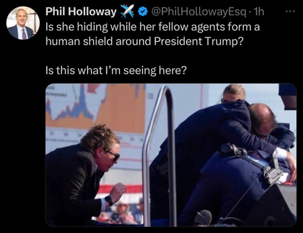 So I countered: “But you read my first article, what about the Pittsburgh office sending temporary agents, the shenanigans with Jill Biden and Kamala Harris suddenly organizing a trip to Pennsylvania, getting a higher threat assessment and thus more resources that were pulled from Trump’s rally, etc? The Secret Service does a lot more than personal protection detail of presidents and candidates, and even with such protection work, there are several different jobs that are needed that do not require being next to the protectee. What if they just pulled this lady from her normal job, at which she might have been really good, and told her to just stand there, as ‘nothing was going to happen, anyway’? What about that comment I showed you? She really looks like someone who did not train for this, at all, safe perhaps for a once in a year certification. Is this close personal protection detail really what she signed up for? Is it fair to blame her and humiliate her for a decision that was made well above her head?”