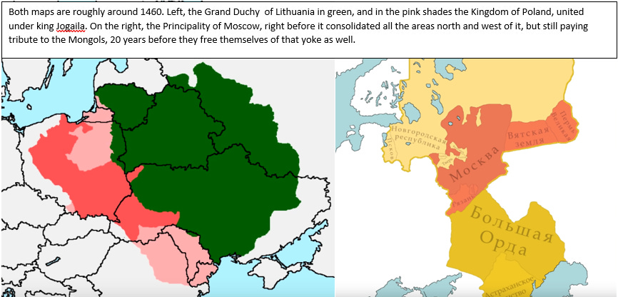 Here is the seed of the disunity. While the northern Rus remained Orthodox, and under Mongol control for a good while, the southern Rus by the mid-14th century became under the Catholic Polish-Lithuanian rule. The Polish nobility was very harsh in their dealing with their ‘serfs’, which lead to numerous uprisings and troubles, including in the mid-17th century, when in 1649 the Cossack Hetmanate was founded, under Cossack leader Boghdan Khmelnytskyi (known and reviled by Jews and Poles alike as Chmiel), in a reaction against suppression by the Polish nobility, demanding more freedoms and rights. Realizing they could not beat the very powerful Polish-Lithuanian armies, the Cossacks approached the Russian Czars, and with the Treaty of Pereyaslav of 1654 swore allegiance to the Russian Csar Aleksey Mikhaylovich, effectively becoming his vassals. This period explains the origins of the Ukrainian distrust/hatred against the Poles (and the Jews).