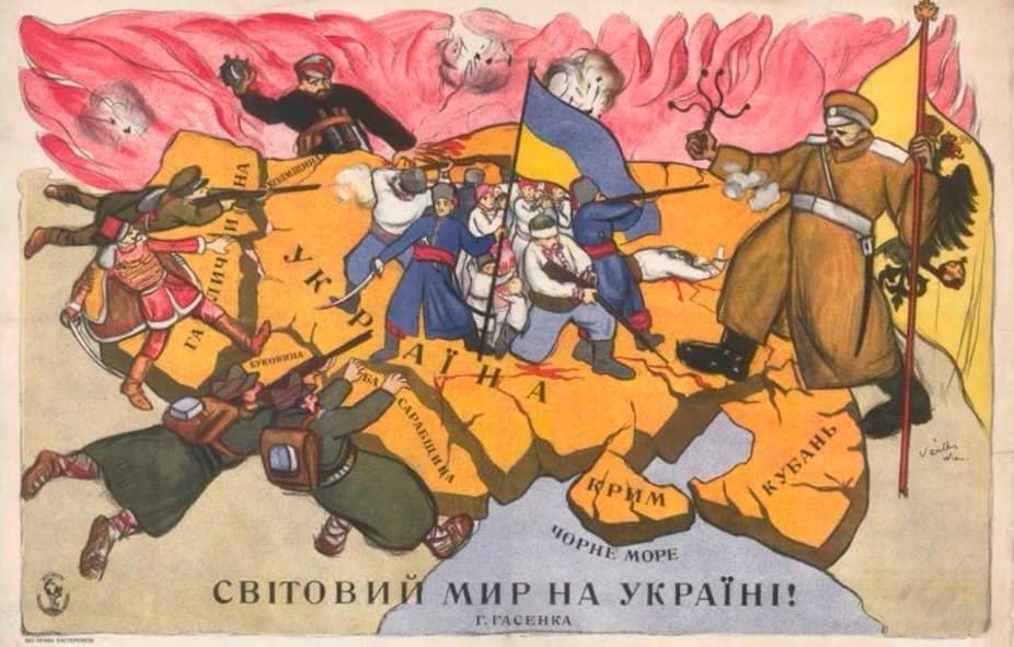 (From The Conversation: In this 1919 caricature, Ukrainians are surrounded by a Bolshevik (to the north, man with hat and red star), a Russian White Army soldier (to the east, with Russian eagle flag and a short whip), and to the west a Polish soldier, a Hungarian (in pink uniform) and two Romanian soldiers. Wikimedia Commons. This old image captures the different modern claimants and competitors to [parts of] Ukrainian land. Historical memory is an interesting phenomenon, let’s look at what really happened.)