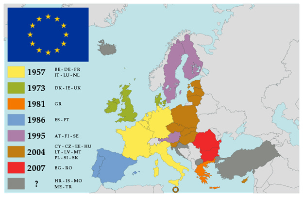 Meanwhile, the EU expanded in 1995, with Austria, Sweden and Finland, and then, also in 2004 (May 1), Cyprus, Malta, Hungary, Poland, Slovakia, Latvia, Estonia, Lithuania, Czech Republic, and Slovenia. In 2007, Romania and Bulgaria joined the EU, and in 2013, Croatia. Membership for North Macedonia, Montenegro, Albania and Serbia are in negotiation (negotiation with Turkey are frozen); Ukraine, Bosnia and Herzegovina, and Moldova are candidates, and Georgia and Kosovo are applicants.
