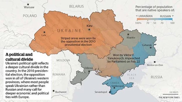 (Notice also the sharp division in linguistic groups, and compare with the current map of actual Russian military operations. This maps explains a lot just by itself!)
