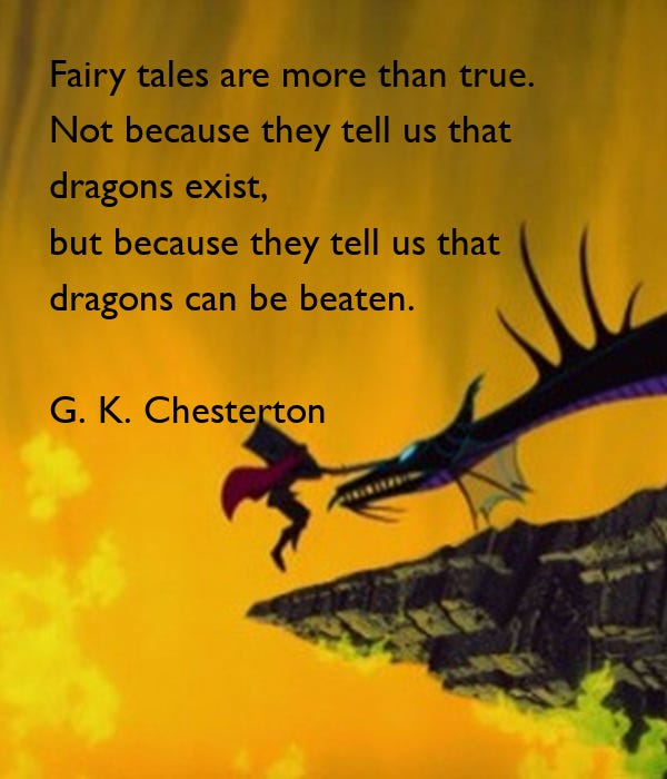 "The timidity of the child or the savage is entirely reasonable; they are alarmed at this world, because this world is a very alarming place. They dislike being alone because it is verily and indeed an awful idea to be alone. Barbarians fear the unknown for the same reason that Agnostics worship it—because it is a fact. Fairy tales, then, are not responsible for producing in children fear, or any of the shapes of fear; fairy tales do not give the child the idea of the evil or the ugly; that is in the child already, because it is in the world already. Fairy tales do not give the child his first idea of bogey. What fairy tales give the child is his first clear idea of the possible defeat of bogey. The baby has known the dragon intimately ever since he had an imagination. What the fairy tale provides for him is a St. George to kill the dragon. Exactly what the fairy tale does is this: it accustoms him for a series of clear pictures to the idea that these limitless terrors had a limit, that these shapeless enemies have enemies in the knights of God, that there is something in the universe more mystical than darkness, and stronger than strong fear."